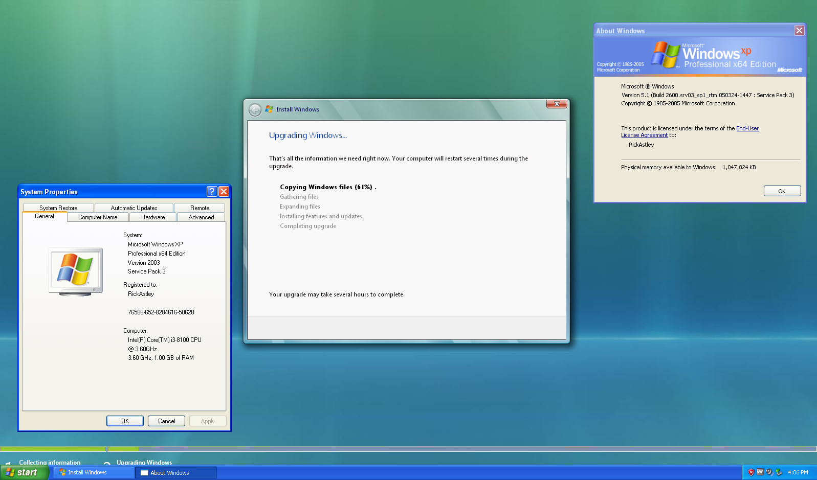 Here is Windows XP x64 Edition upgrading to Windows Vista x64. This is normally unsupported.